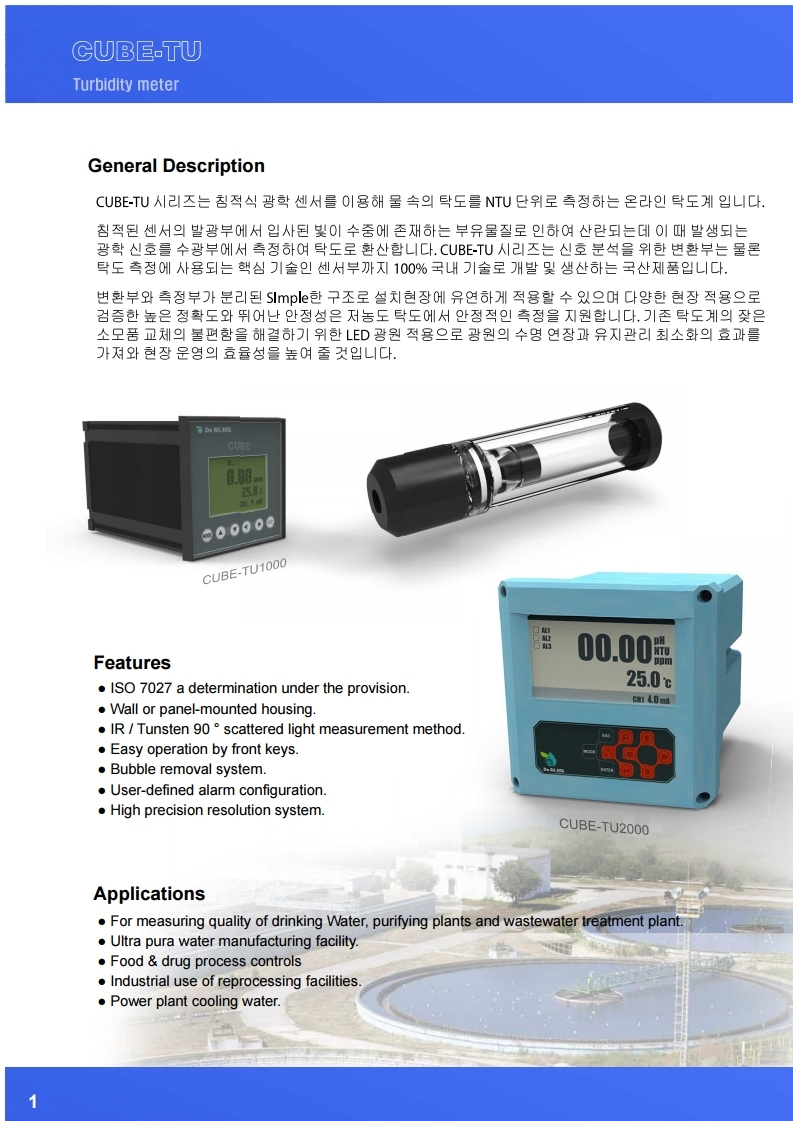 CUBE-CL Series는 폴라로그래피센서를 이용해 물속의 잔류염소 농도를 연속으로 측정하는 온라인 잔류염소 측정기입니다.